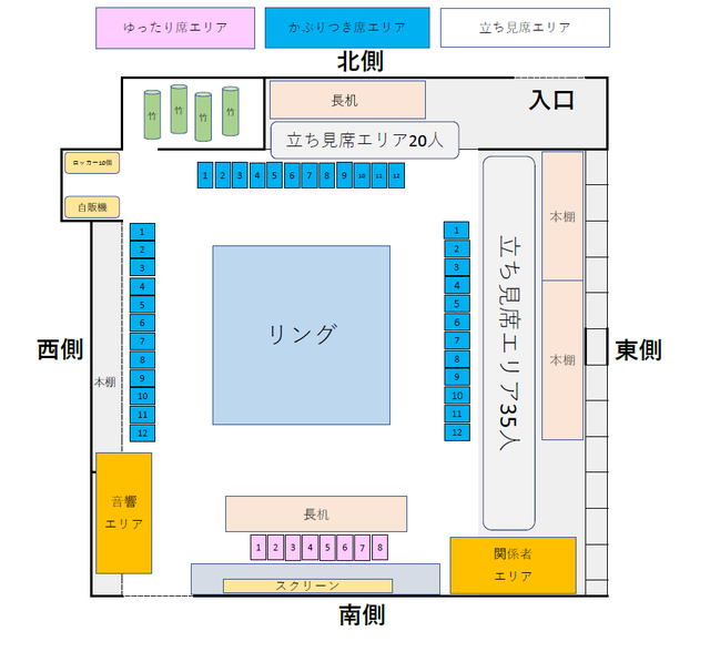 東・西・北側いずれかの最前列席36席(座席表の青色の席)。