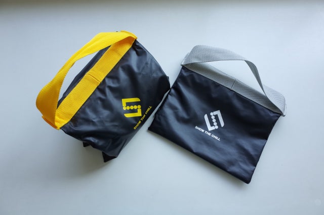 1.ステンレススチールの比重は7.93と大きいことから、これをバッグに入れたならコンパクトな重りが出来るのではないかとの提案があり、早速試作品の製作に取り掛かかるとともに自社ブランドを「SHOW THE CHILL」 製品名を「ウエイトバッグ」と命名しました。