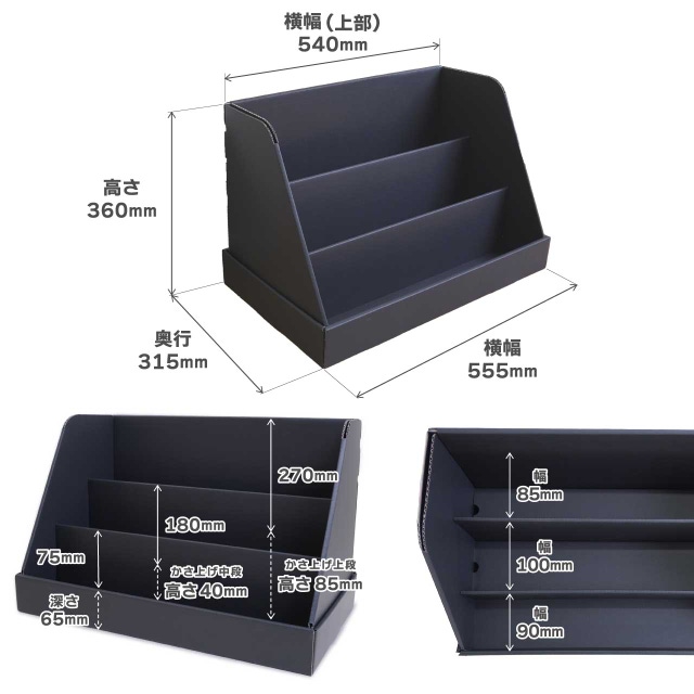 3段に分かれているので分類しやすく、底上げパーツが付いているので、高さの調整が可能。本などの表紙も見やすく収納できます。