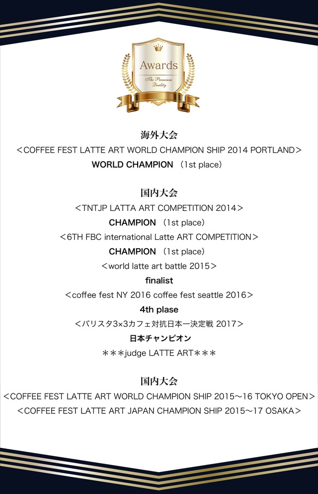 2014年10月にアメリカのポートランドにて開催の“COFFEE FEST LATTE ART WORLD CHAMPION SHIP 2014″にて優勝。