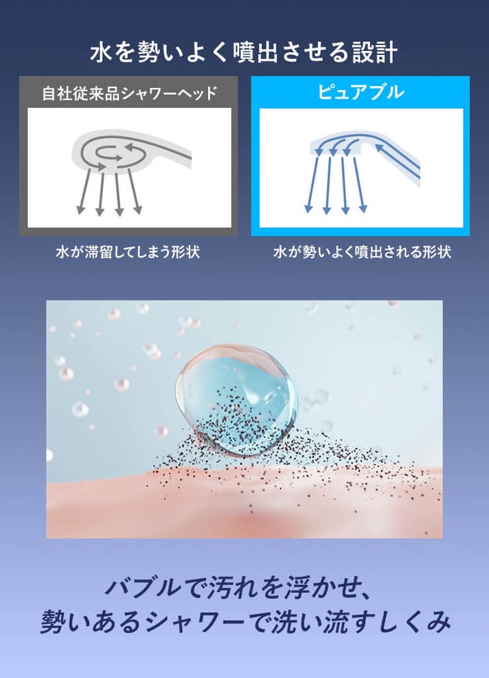 - 洗浄力の決め手は適切なバブルサイズ、勢いあるシャワーで皮脂汚れを落とす!