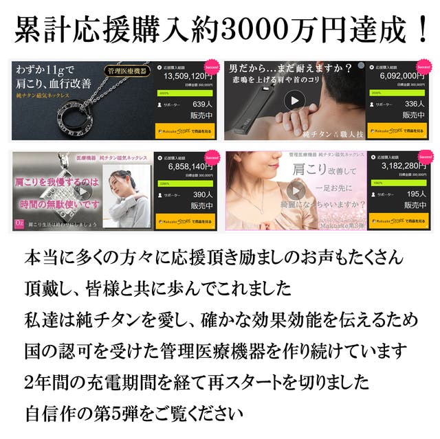 私たちは、管理医療機器の認可を受けた確かな商品を作り続けて20年になります。(金属加工は57年以上) その経験を生かし、確実にスピーディーに製造し、一日も早くお届けし、一日も早くつらい肩こりを緩和できるよう尽力いたします。 活動レポートでも随時製造状況を報告いたします。 私たちは皆様の声をもとに喜んでいただける磁気ネックレスを次々に生み出していきたい! 厳しく暖かい応援の程を宜しくお願いいたします。 本文中に記載させていただいたスケジュールは、あくまでプロジェクト公開時点の予定です。応援購入の性質上、配送遅延のおそれがございます。 原則として、配送遅延に伴う応援購入のキャンセルはできませんが、リターン配送予定月から2ヵ月を超えた場合には、希望者に限りキャンセルにて対応させていただきます。
