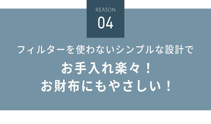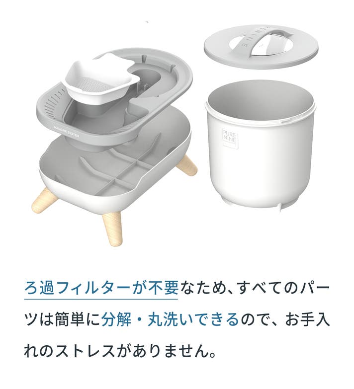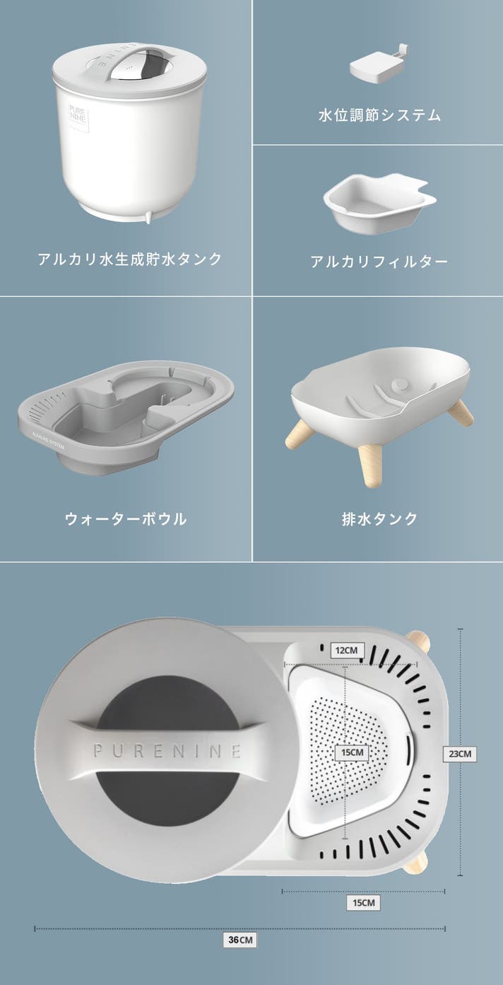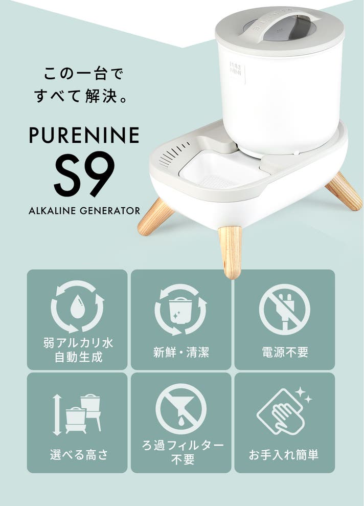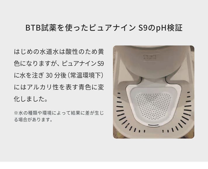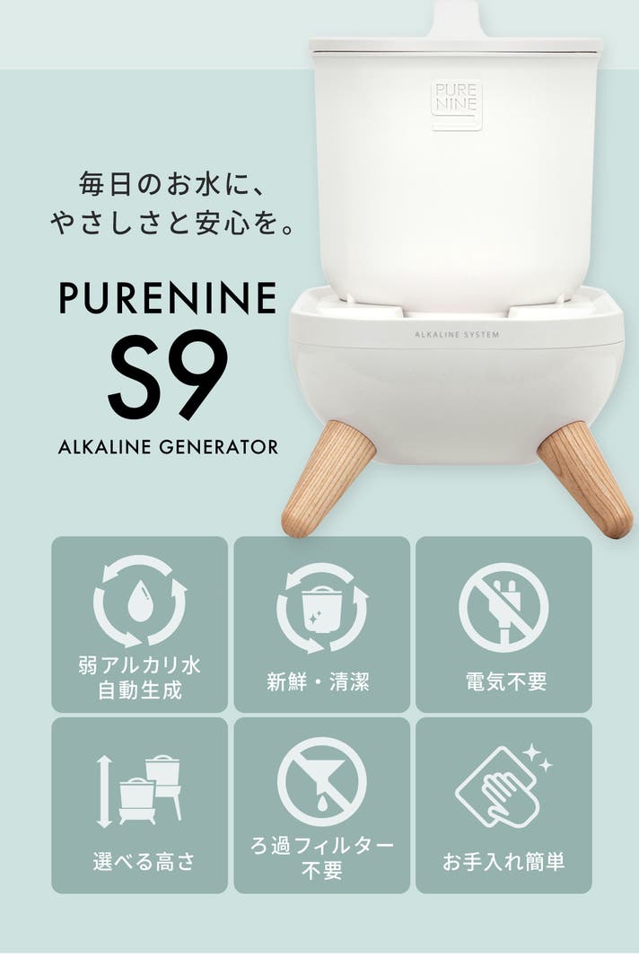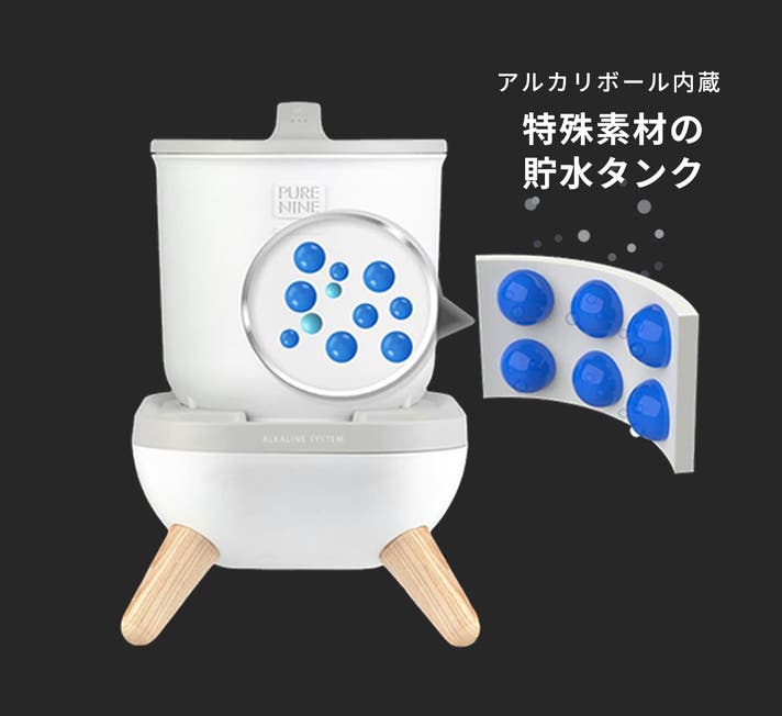 A: S9の貯水タンクには、弱アルカリボールをコーティングした特殊素材を採用し、フィルターや電源を使わずに自然に弱アルカリ化されます。