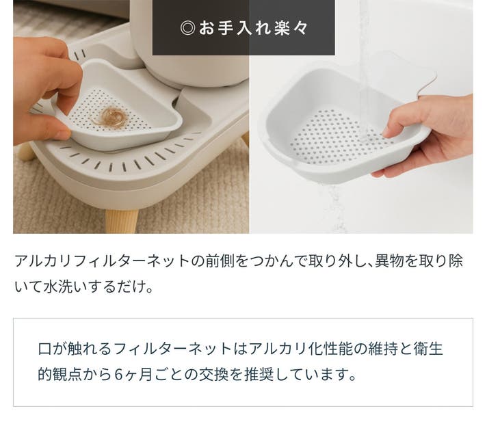 また、漂白剤や研磨剤、たわしなどを使用すると、弱アルカリ化効果の持続に影響する場合がありますので、ご留意ください。