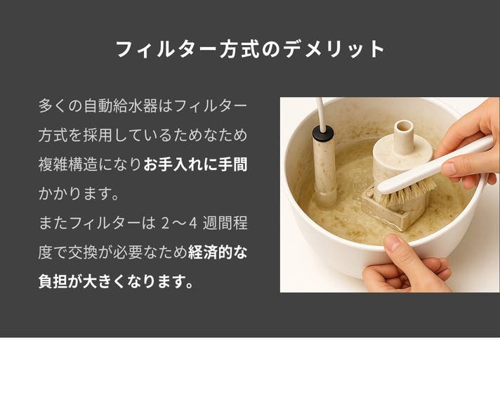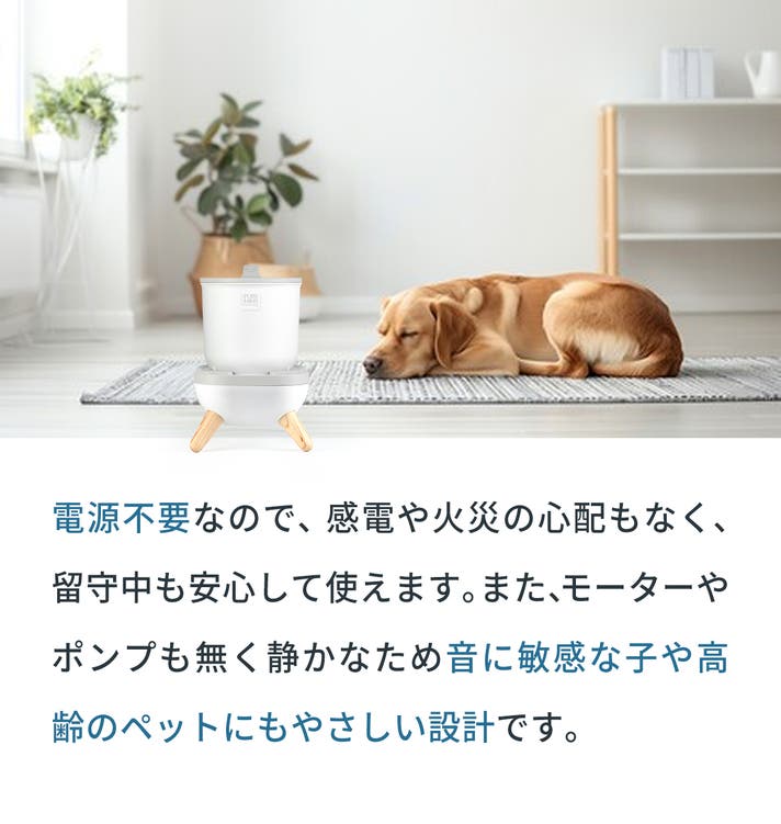 - 電源不要|貯水タンクから直接供給する直水方式のため、水はいつも清潔で新鮮!お手入れも楽々◯