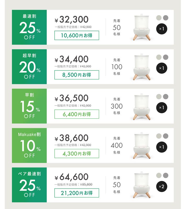 ※Makuakeでプロジェクトを応援購入する際に、一律してお客様にお支払いいただく「安心システム利用料」の導入により、上記の価格に加えて売価×2.42%(税込)が決済画面でかかります。
