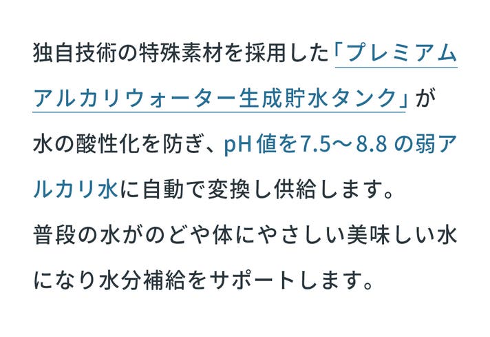 A: 貯水タンクに水を入れた瞬間から弱アルカリ化が進みます。