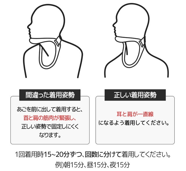 1日2~3回、使用時に最大15分使用することをお勧めします。 15分以上お使いになると、むしろ首や肩にさらに負担がかかることがありますので、15分以下でお使いいただくことをお勧めします。 また、首や肩に異常が生じた場合は、使用を中止して専門医に相談してください