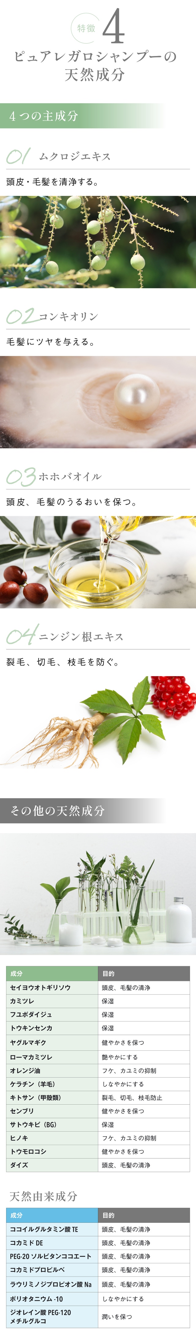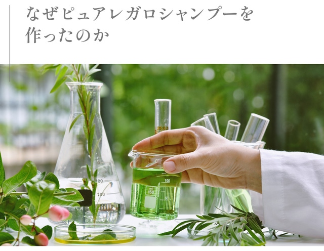 そこからさらに改良を重ね、今回は天然成分にこだわったピュアレガロシャンプーを販売させていただくこととなりました。