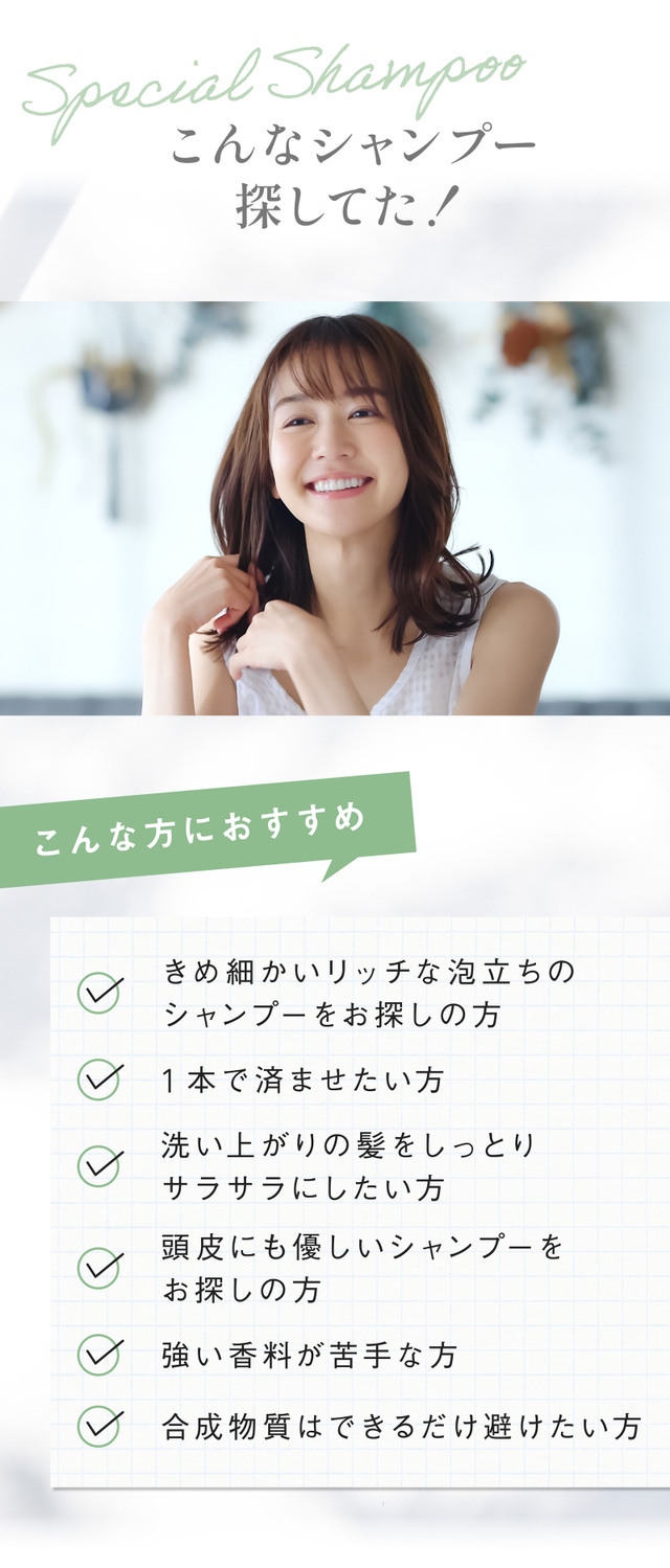 優しい洗浄成分が無理なく汚れを落とし、豊富な天然成分で補修・保湿・保護を行うため、トリートメントやリンスをしなくても艶やかな洗い上がりに。
