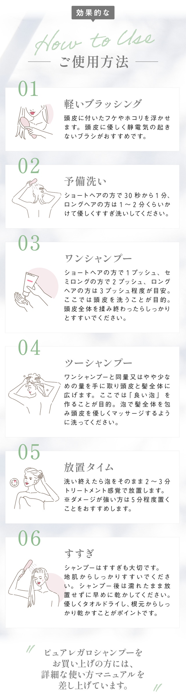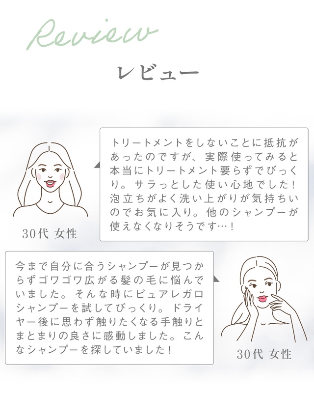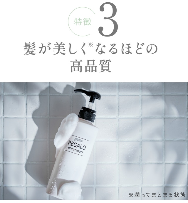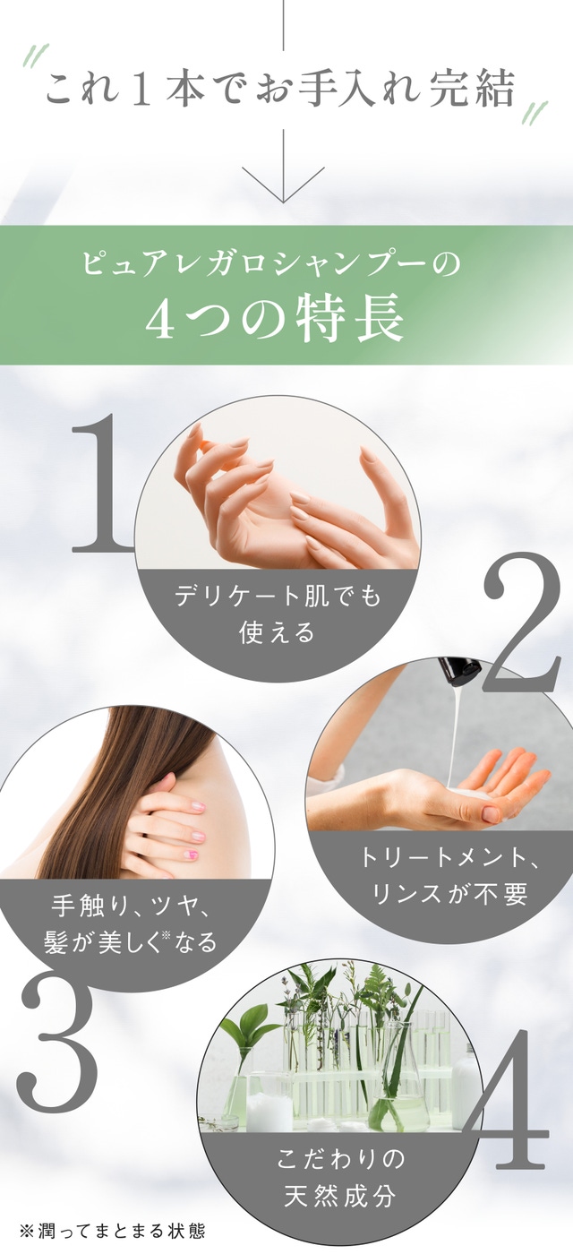 ※髪の状態により深刻なダメージがある場合は、ピュアレガロシャンプーを使用してもきしむことがあります。