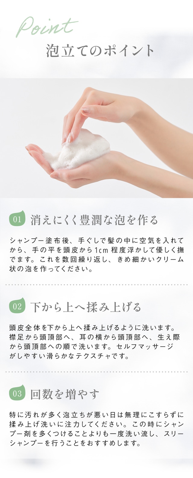 もこもこの泡で優しく洗うことで、摩擦が起きづらく、髪や頭皮に負担をかけません。
