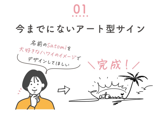 名前+イラストのアート型サイン「ピュアサイン」。新しいマイサインとして何よりこだわっているのは、クオリティです。