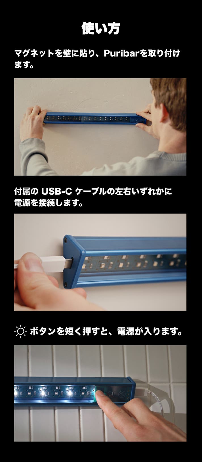 私たちは、405nm可視光線による除菌技術に着目し、薬剤を一切使用しない、ライトベース除菌デバイス PURIBAR を開発しました。