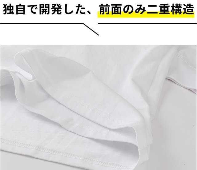 肩線の長さは外側のTシャツに合わせて、袖ぐりとバスト、身幅を小さくすることにより、膨らみを抑えつつ、着心地も良く、大きなシワが出ることもありません。