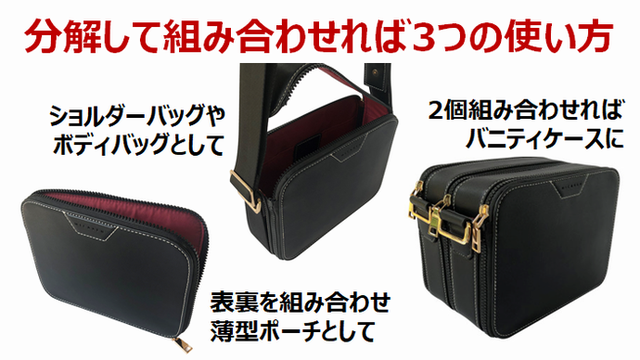 バッグは4つに分解できるので、表面・裏面を組み合わせればポーチに、2個のバッグを組み合わせれば、メイク道具などをしまうバニティケースとして利用できます。