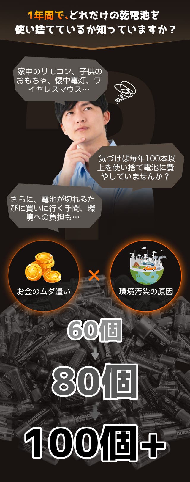 現代の暮らしでは、リモコンやおもちゃ、マウスなど、日常のあらゆるシーンで電池が必要とされています。私たちは、そうしたニーズに応えるべく、「使いやすさ」と「経済性」、そして「環境へのやさしさ」を兼ね備えた充電式電池セットを開発いたしました。