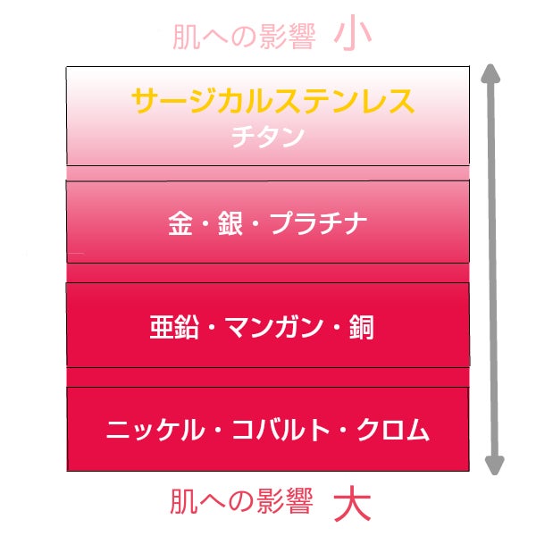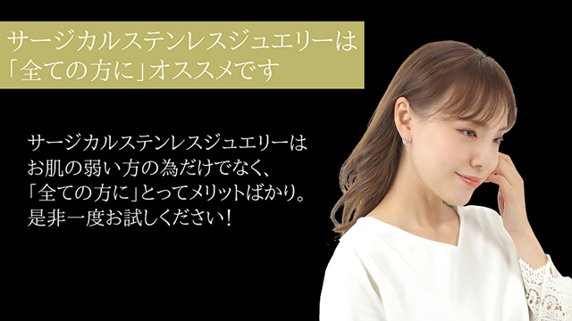 ステンレスジュエリーは、メッキ加工をせず、ステンレスそのままの素材の為、お肌に優しいのが特長です。これまでお肌が弱く、アクセサリーでのおしゃれを諦めていた方にも、「気軽に、自由に」アクセサリーをお楽しみ頂けます。