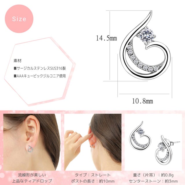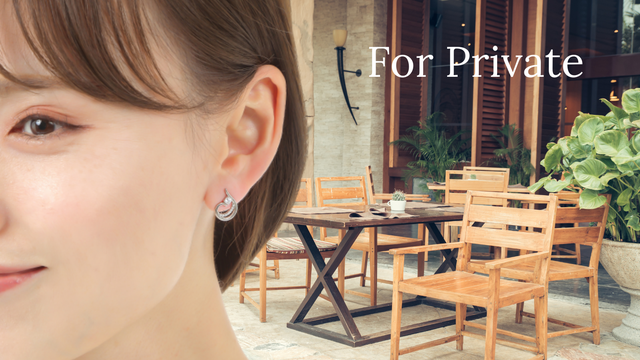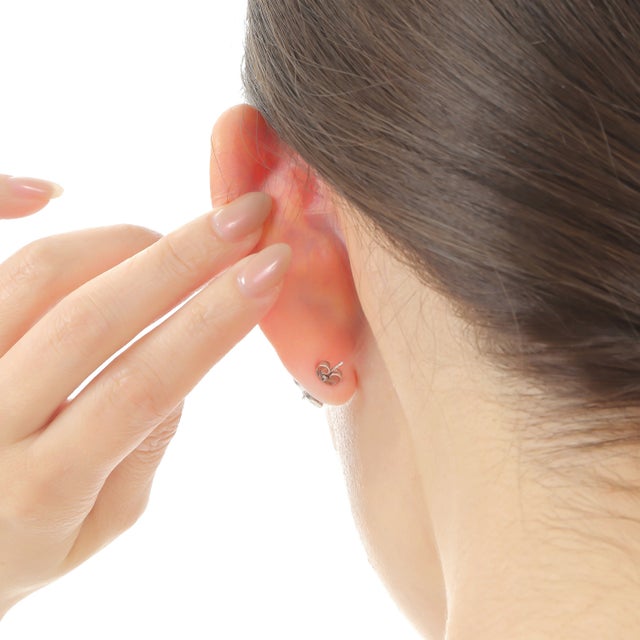 耳元に密着するタイプなので、輪郭の中心あたりで目に入りやすいのが特長です。 着脱が簡単で安定しやすいので、ピアス穴をあけたばかりの方でも着けやすいです。