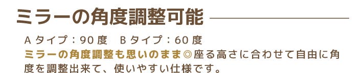 A:ミラー部分は角度調整が可能です。Aタイプは90度、Bタイプは60度まで角度調整が可能です。使用シーンに合わせて、見やすい角度に調整してご使用いただけます。