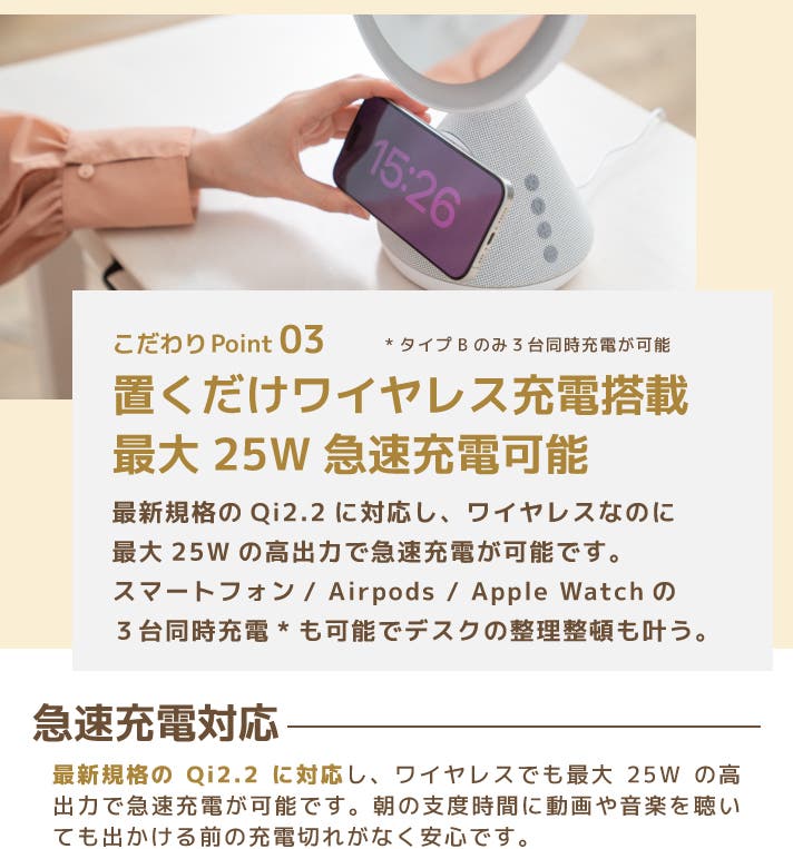 - QI2.2搭載。置くだけで最大25Wの急速ワイヤレス充電を実現