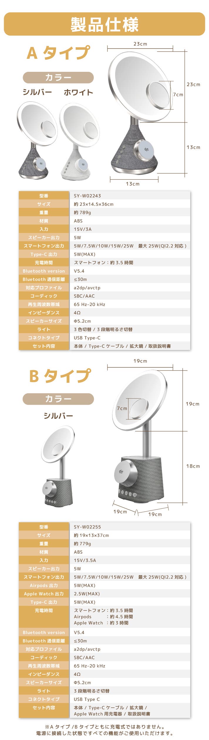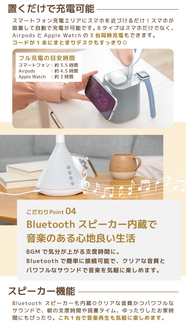A:Bタイプのみ可能です。スマートフォン/Airpods/AppleWatchの3台同時充電が可能です。スマートフォンは、MagSafe対応機種またはワイヤレス充電対応機種かつマグネット式スマホケース装着の場合に使用可能です。