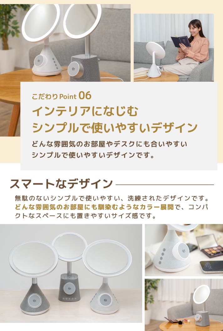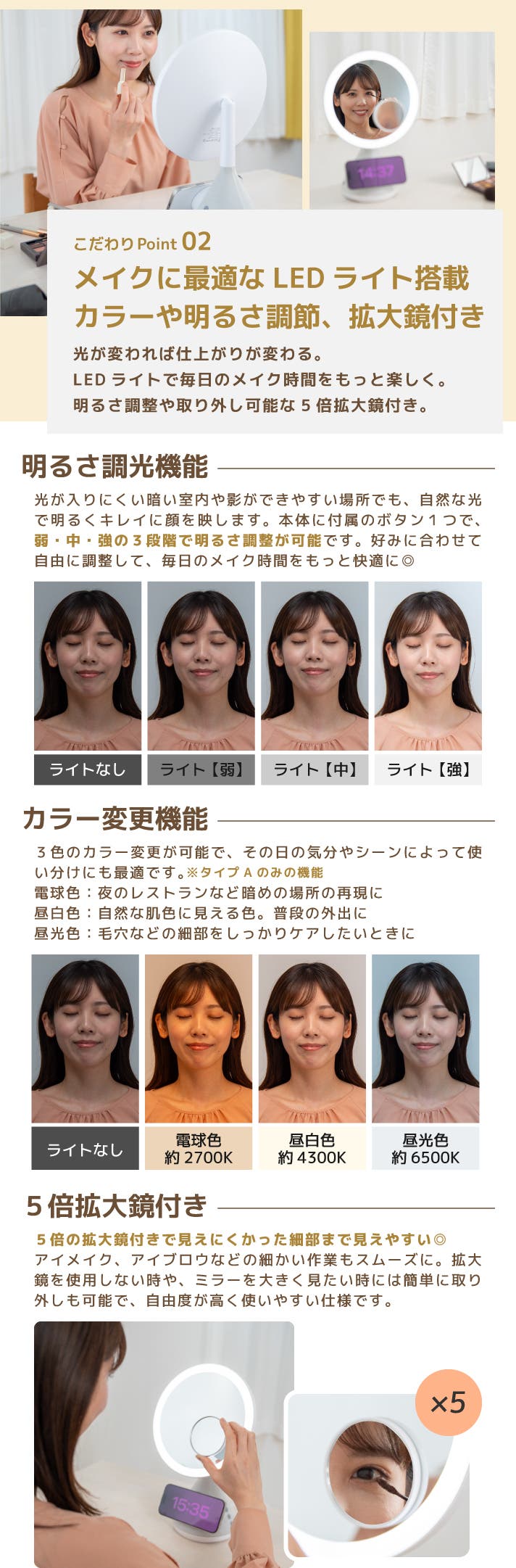 - メイクに最適なLEDライト搭載。明るさやカラー変更機能、拡大鏡付で、細部まで妥協しない仕上がり