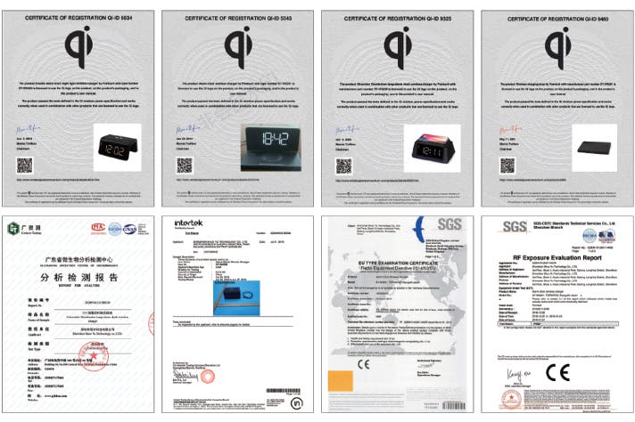 Qi規格をはじめ、CE・RoHS・FCC・REACH・CA65など各種国際認証を取得し、品質・安全性の両面で高い基準を満たしています。さらに、BSCI・ISO認証工場として、国際的な監査基準にも対応しています。
