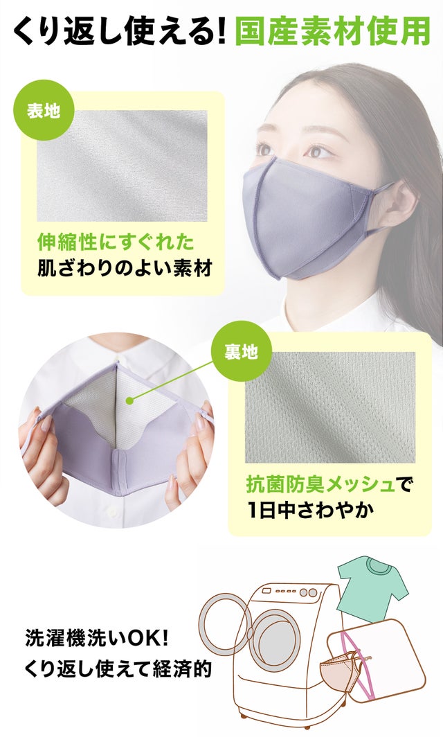 ・日本製のソフトに伸縮するストレッチ素材と抗菌防臭メッシュ素材を使い、長時間さわやかに呼吸できるマスクです。