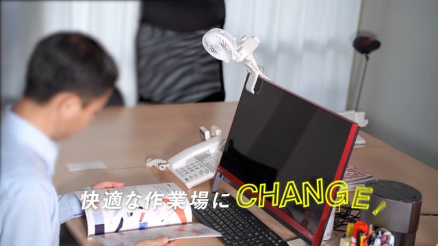 真夏暑い外出時に汗だくのビジネスマンの方にハンディファンをカバンに取り付けて少しでも涼しく快適に過ごしてもらえるファンフォルダー。