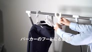 1. 室内物干しにハンディファンを取付けて乾かしたい靴の中、フードにス集中的に風を当てて乾燥させる。