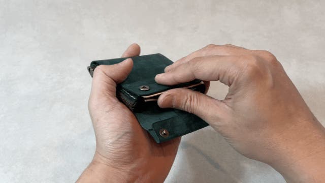 コインポジション時、上部の革をめくるとお札を「スッと」引き出せる、小銭だけでは足りない場合に便利なポジション