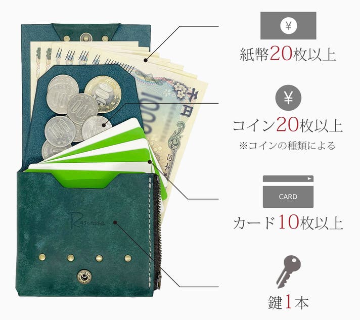 【推奨収納枚数】紙幣:12枚・コイン15枚・カード8枚・鍵1本