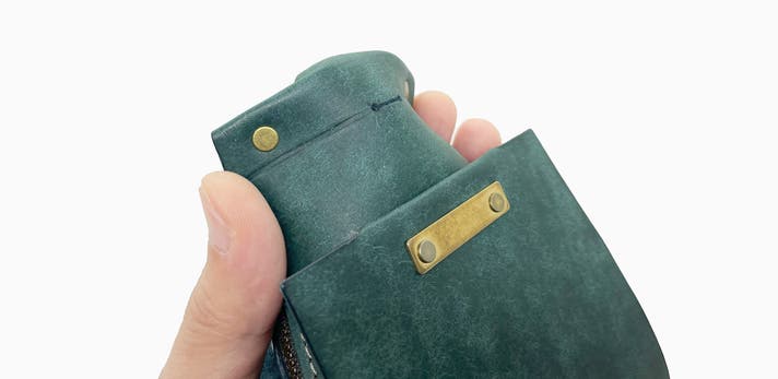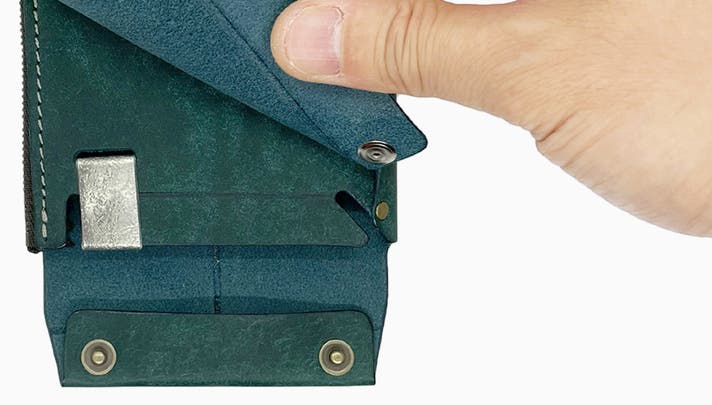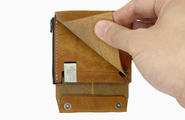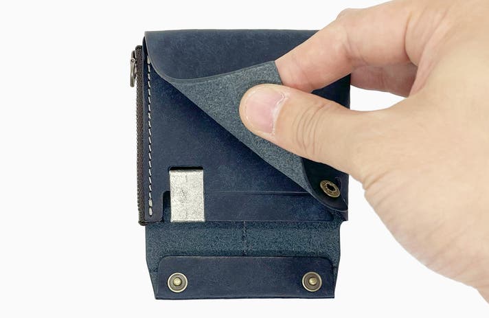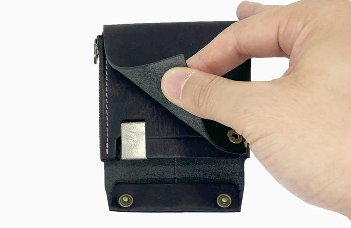 「押す・つまむ・握る」動作をスムーズに行うべく、緻密に計算された背面フラップ、フタの薄さはそのままに、コインストッパーを素早く展開する為、様々な仕掛けを搭載