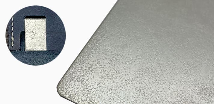 錫のれんスリット右側は斜め45°の形状、左と同様の真っすぐな切れ込みだとお札をしまう時引っ掛かりが発生する、45°にする事により引っ掛かりが緩和され、同時にコインも飛び出しにくい形状に