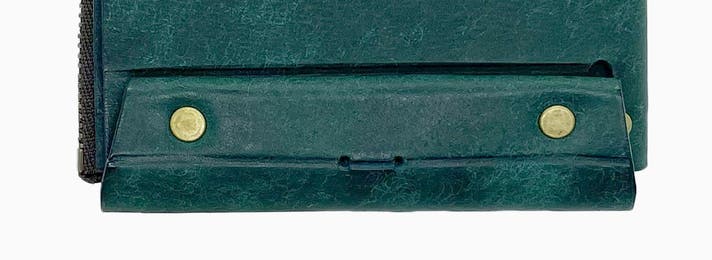 ボタンよりも広範囲で固定しているので革への耐久性も高くフラップも開けやすい