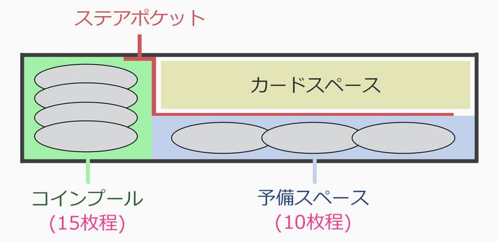 硬貨が収まるコインプールには15枚程収納可能、また15枚を超えた場合、予備スペースにもストック出来る、合計25枚程度収納可能(推奨18枚前後)