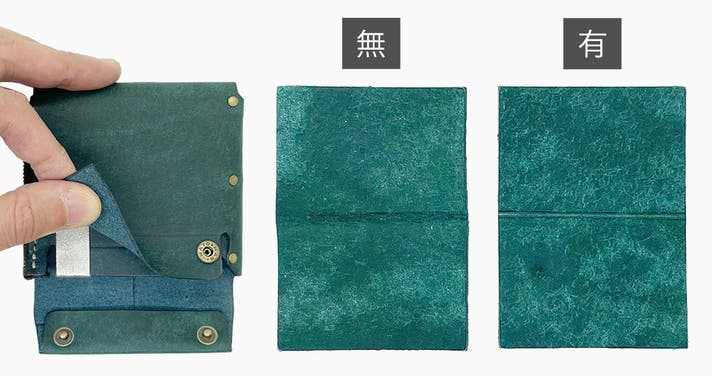 通常革製品は、山折りは頻繁に使われるが谷折りにする事は極端に少ない、原因の一つとして革の表面にシワが出来てしまうからである