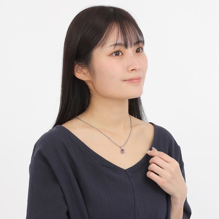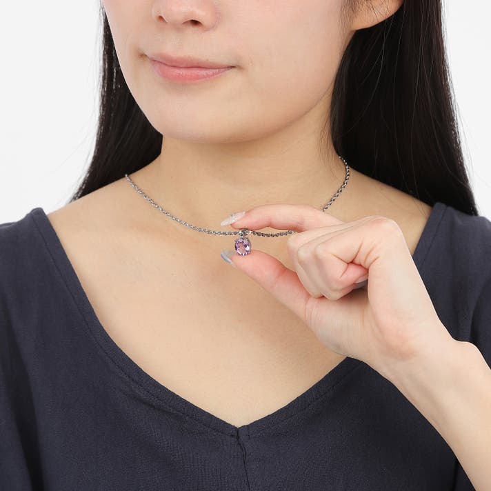 オーバルカットのペンダントは、縦のラインが強調されるため、首筋をすっきりと見せてくれます。