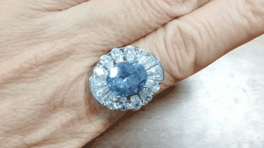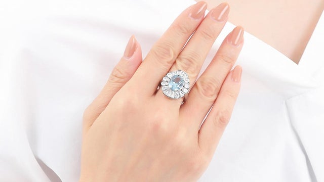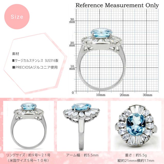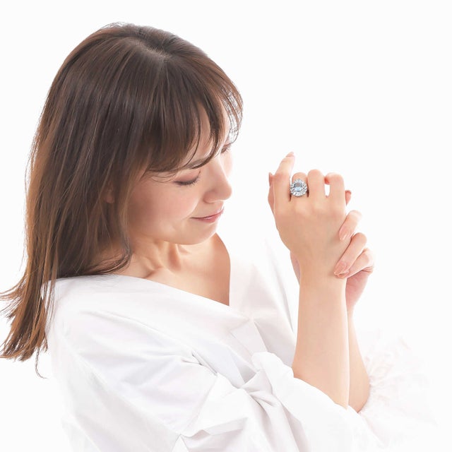 直径約12mmの大粒アクアブルージルコニアが印象的。オーバルカットを施したセンターストーンの周りをテーパードとペアシェイプカットを施したジルコニアで囲み、レール留めや爪留めなど宝飾品と同様の高度な技法を使った本格的なジュエリー。