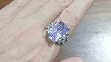 縦約16mmの大粒ラベンダージルコニアが印象的。オブロンカットを施したセンターストーンの脇にはクリアーのジルコニアをあしらい、サイドにも透かし模様を施した華やかでディテールまでこだわった立体的なデザインです。爪留めなど宝飾品と同様の高度な技法を使った本格的なジュエリー。