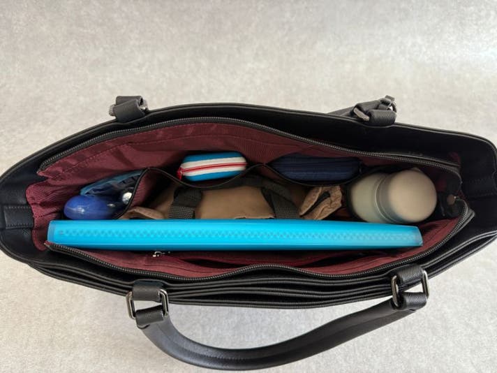 分厚い会議資料、お弁当、飲み物、仕事帰りのジムウェア。
