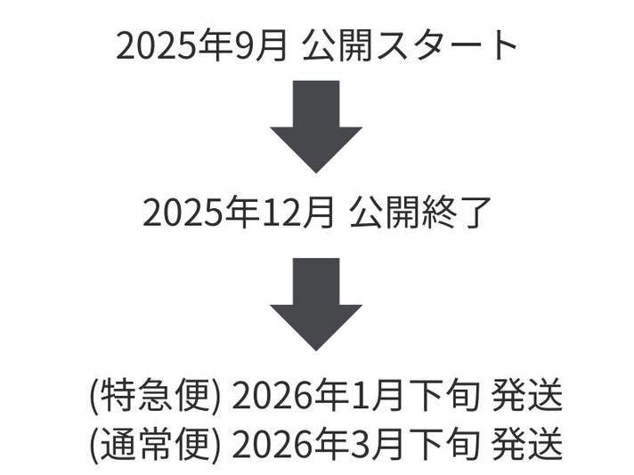 プロジェクト公開後の生産となりますので、特急便が2026年1月下旬、通常便が2026年3月下旬発送を予定しています。
