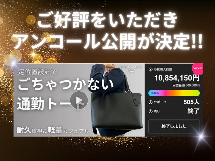 「Makuake(マクアケ)」は、実行者の想いを応援購入によって実現するアタラシイものやサービスのプラットフォームです。このページは、 ファッションカテゴリの 「【アンコール】スマホは"差すだけ"。片手でサッと取り出せる快適通勤トート」プロジェクト詳細ページです。