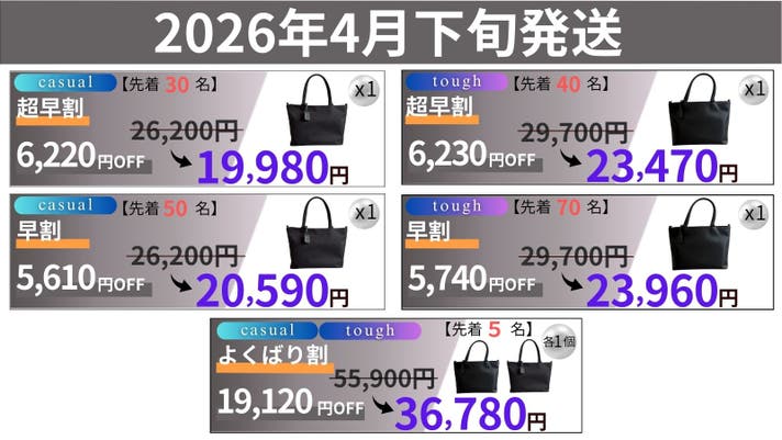 - 【応援購入総額3億円突破!】ビジネストートに「耐久タフ」「軽量カジュアル」2種類の新素材登場!
