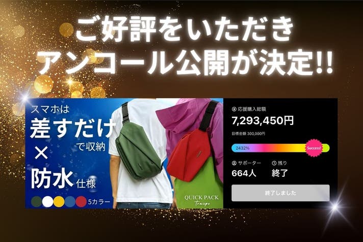 「Makuake(マクアケ)」は、実行者の想いを応援購入によって実現するアタラシイものやサービスのプラットフォームです。このページは、 ファッションカテゴリの 「【アンコール】探さない、濡らさない、“差すだけ”で動ける!快適ミニマルバッグ」プロジェクト詳細ページです。