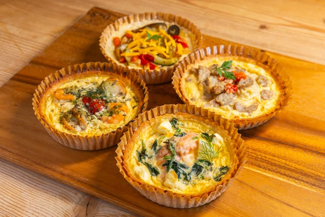 グルテンフリーの米粉キッシュ。手前から時計回りにサーモンマリネとほうれん草、エビとホタテのシーフード、彩り野菜と豆乳クリーム、自家製ソーセージとマッシュポテト。