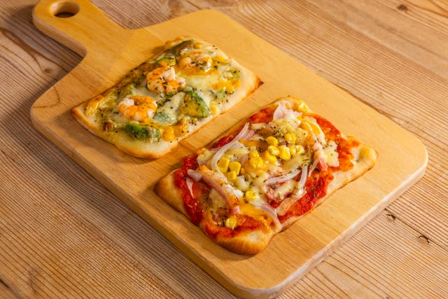 地元のコシヒカリを使用したグルテンフリーの米粉ピザ。トマトベーコン、エビとアボカド。