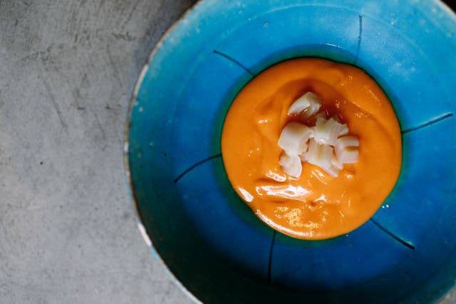 北海道産帆立とトマトを使った冷製スープサルマレッホ