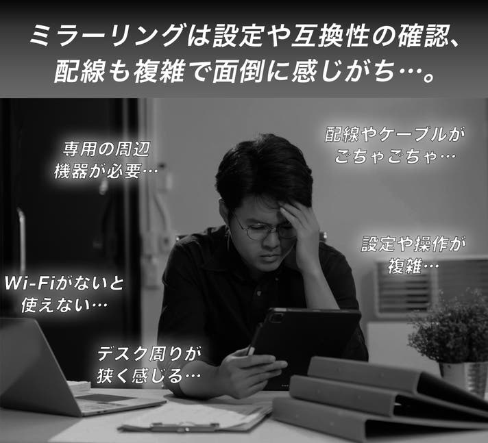 ミラーリング機器を使うと、ケーブル配線が増えてしまうのが悩みの一つです。配線がごちゃごちゃしてしまうこと。